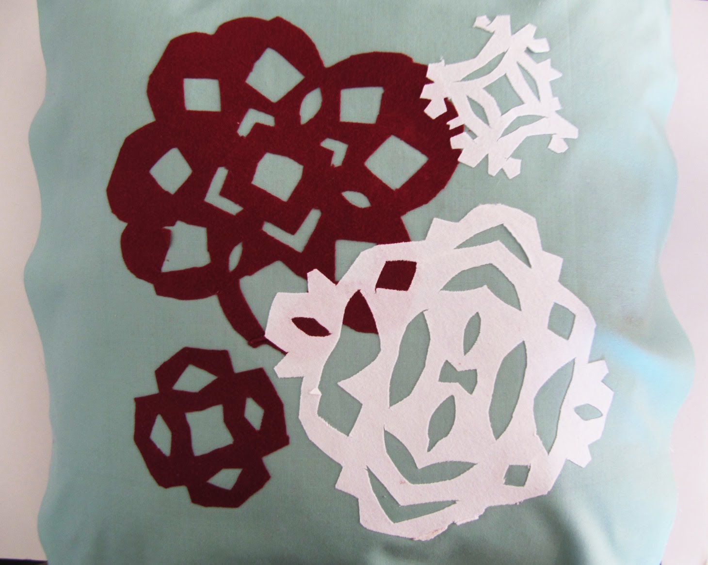 | Step 11: Finish cutting out the rest of your snowflakes, then lay them out on the pillow top to see how you want them arranged. Make sure to do it on the pillow so you can really center them. And then iron them on…ironing one at a time, leaving the iron on the fabric for about 3-5 seconds so it can bond. |
