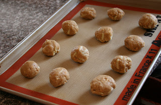 Drop by rounded tablespoonfuls on a greased or Silpat lined cookie sheet and bake at 375 degrees for 10-12 minutes. Cool for 5 minutes. Yields about 1 1/2 dozen.