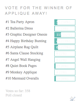 Thanks to everyone who voted in the Applique Away! contest, and thank you to everyone who participated! It was fun for me, and a great first contest I think. I will be having contests every few months to keep you all motivated to keep crafting, sewing, and basically being the amazing people you already are. 🙂