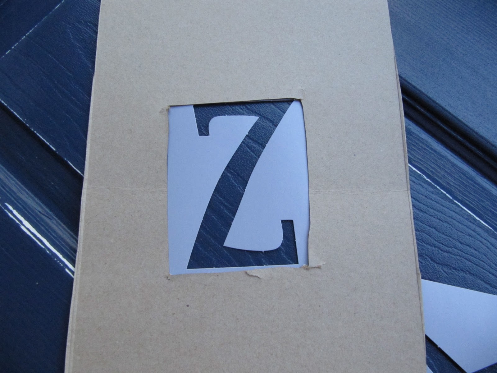 | To spray paint, tape down the stencil first with masking tape. Then I cut a rectangle out of some cardboard to make a guard. Mine wasn’t nearly big enough though so I had to do a lot of re touching. |