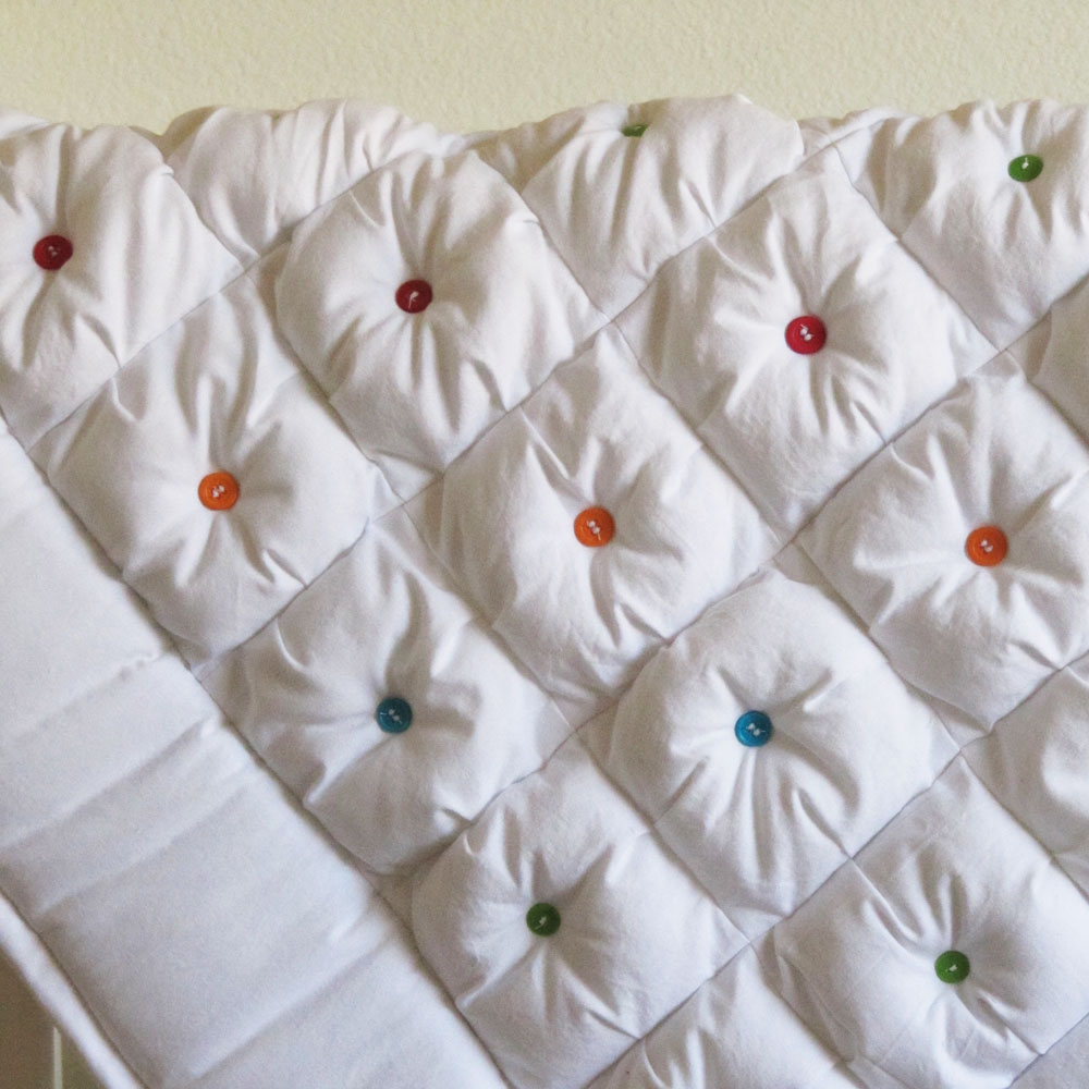 UPDATE:  IF THIS QUILT IS FOR A BABY, DON’T SEW BUTTONS ON.  YOU CAN USE FELT BUTTONS OR COLORED EMBROIDERY THREAD INSTEAD.  THE BUTTONS ARE A CHOKING HAZARD AND I DIDN’T GIVE THIS QUILT AWAY.