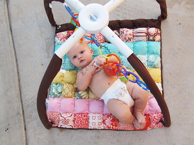 I will be making that, minus the thing that goes on top (the ‘gym’ part.) But as I said before, I’d add some ribbon ‘taggies’ and loops for adding links and toys, etc. The bottom is just fabric, no batting in between. I actually use this all the time (without the gym), since it’s the perfect thing to take outside. It’s soft enough to put on concrete and have the baby lay on while my toddler runs around. And since it’s not super fancy, I’m totally not worried about it getting dirty. I LOVE it.
