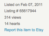 Pay attention to your “hearts” and views. You may have a particular item that gets more hearts than the others (hearts are Etsy’s way of ‘favoriting’ an item) or more views. You want to promote that item above the others. You will want to renew that item every time you renew. That item will bring people to your shop, and maybe they will stay and view other items, and maybe even purchase! (You can see who is hearting your shops and items with Etsy’s “Activity Feed” link!)