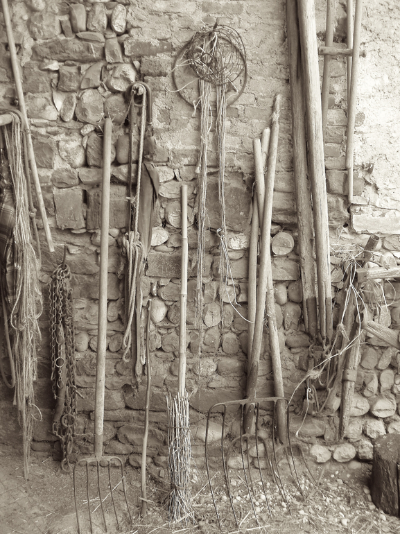 Color schemes are neutral and earthy: gray, white, off-white, beige, tan, brown. There is a lot of white painted wood as well as natural raw wood and stone.  I love this photograph and how it shows the rustic old farm tools that probably sit in the old stone barn.