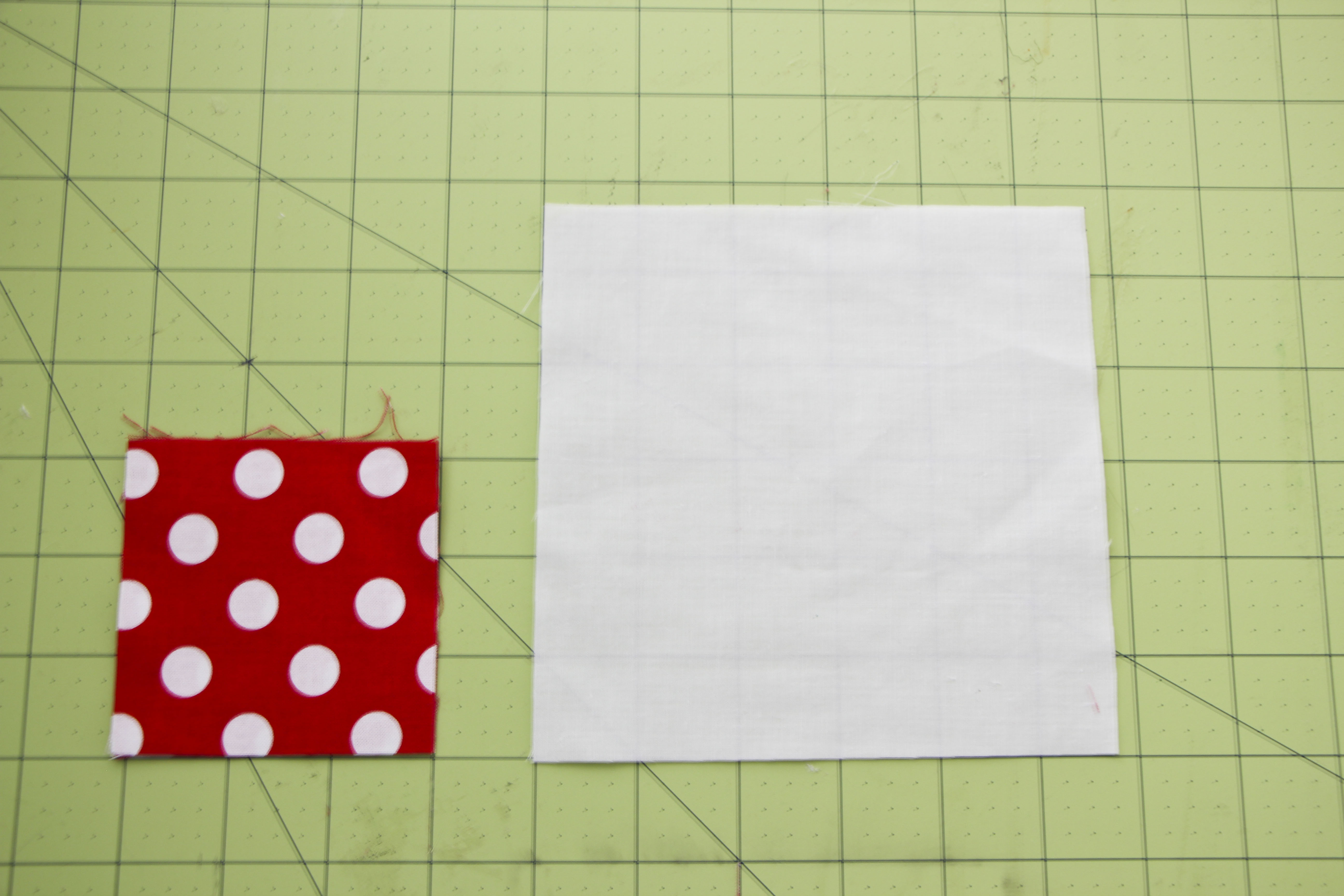 First start by layering two small squares on a diagonal, right sides together with the larger square.