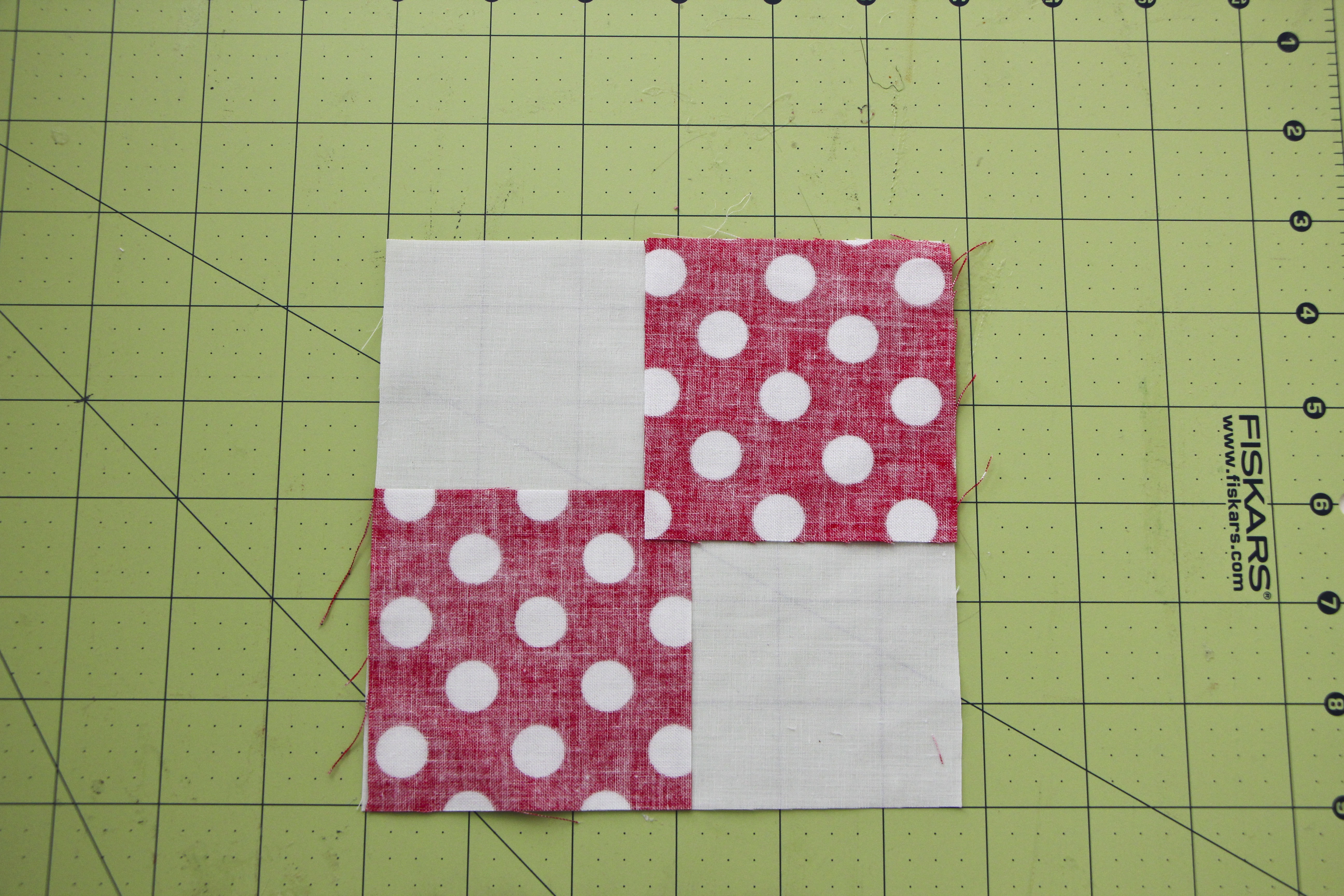 Then layer the two other small squares, matching them up with the remaining open edges of the large block fabric.