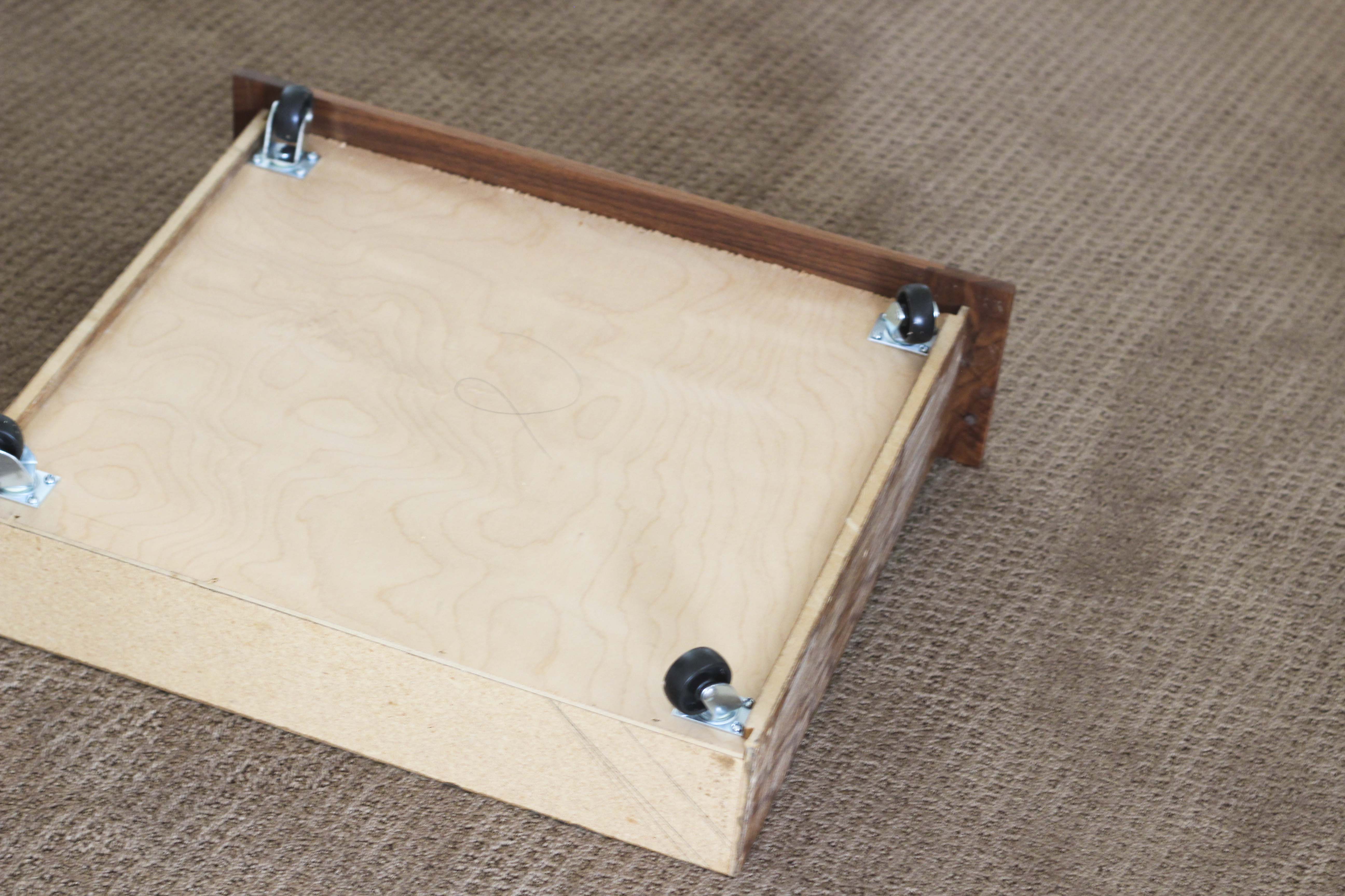 Place your wheels on the bottom and mark the holes with a pencil. Then drill through. Attach the wheels. My bolts show through to the inside of the drawer because I don’t care (It’s not dangerous or pointy) but if you care or need extra durability, use some 2×2 blocks of wood in the corners and drill screws into the wood to hold the wheels on (inside or outside the drawer, whichever is your preference.)
