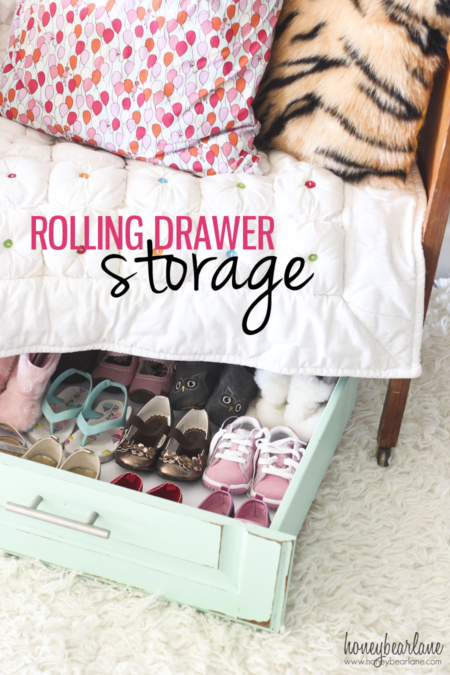 Then fill any existing holes with putty, sand, and paint. I spray painted the inside with KILZ spray primer and the outside with Glidden Sea Glass. Attach your hardware and you are done! Now I have some organized shoe storage for my daughter’s room! Rolling drawer storage is seriously such an easy solution that anyone can do for minimal effort and cost. Go try it!