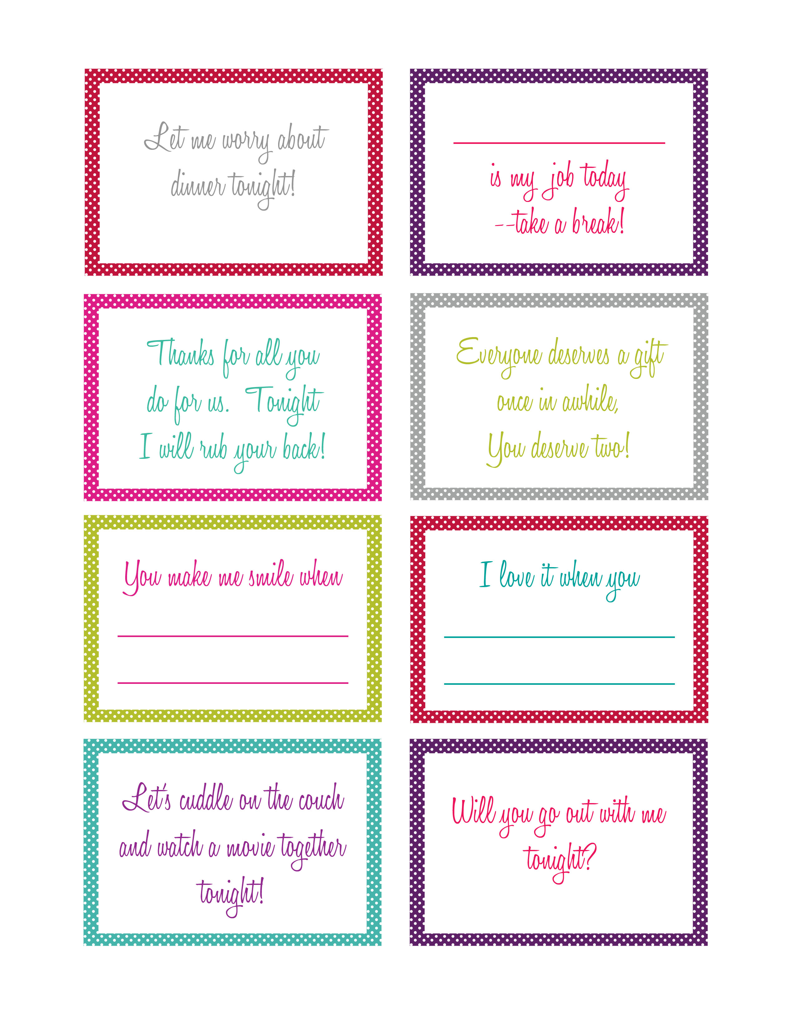 Valentines is approaching. And the same old flowers and chocolate candy can get a bit predictable and therefore, non-special. Something I want to try this year to make Valentine’s really special is to do two weeks of loving acts for my husband. We took a test last week to discover our Love Languages. We were both very different, but everyone has some of all of the 5 love languages. I made these cute printable cards to do 14 days of Love to your significant other. This is a easy way to make Valentine’s day special, just fill out the card and put it somewhere where your spouse will see it–then follow through on what the card says. I designed the cards with all five love languages in mind and there are 16 total, so you can omit whichever two you want.
