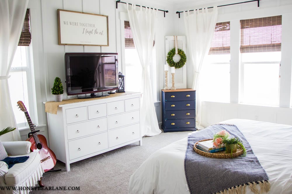 After: I did board and batten on all 4 walls and crown moulding. We switched the bed to be on the other wall because we upgraded to a King size bed and it didn’t get between the windows. I hung curtains which still need to be hemmed! I love the beach vibe in this room, it feels very summery and relaxing. I still have some other things to add, like doing the tray ceiling and replacing the closet hall door with a barn door. Eventually we will also do something about the TV eye sore.
